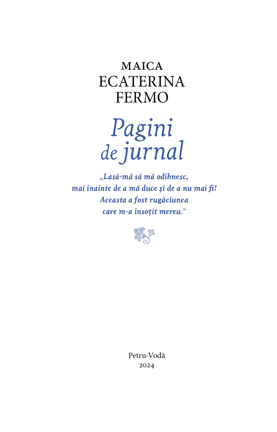 Cu mila lui Dumnezeu, am reușit să scoatem din tipar, o nouă carte editată la Mănăstirea Paltin Petru-Vodă, dedicată memoriei Maicii Ecaterina Fermo, care a trecut la Domnul, pe Care mult L-a iubit, în ziua de 13 noiembrie a anului 2022. Maica Ecaterina Fermo – Pagini de Jurnal.